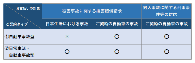 代表的な自動車保険の弁護士特約には ①自動車事故型 ②日常生活・自動車事故型の2つがあります。(保険会社によって呼称は異なります)